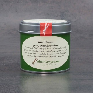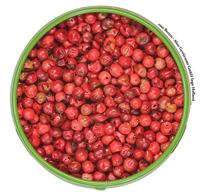 Rote Schinusfrüchte. Rosa Beeren sind nicht scharf und schmecken ähnlich wie Wacholder, jedoch weniger intensiv. Bitte nicht mit echtem roten Pfeffer verwechseln! Achtung: Nicht für die Mühle geeignet!